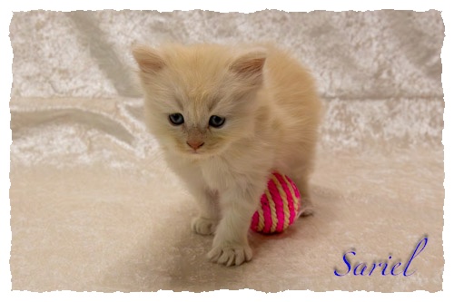 Am Donnerstag, den 09. Oktober 2025 um 3:57 Uhr kam Sariel als viertes und letztes Kitten zur Welt. Nach der Geburt wog Sariel 83 g.